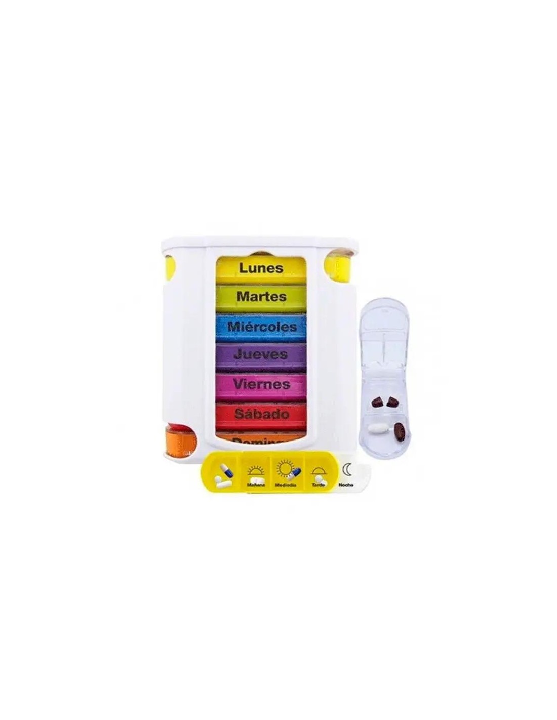 Acofar pastillero semanal con cortador es un práctico organizador para los tratamientos diarios. Permite separar las tomas por medio de compartimentos diarios de diferentes colores en función del momento del día. Cada compartimento viene rotulado como mañana, mediodía, tarde y noche. Estos rótulos están reforzados con imágenes representativas de la hora del día. Viene con siete módulos, uno para cada día de la semana. Estos son módulos extraíbles ideales para llevar, guardar en un bolso o bolsillo. Es un producto muy útil durante los viajes, resultando muy fácil de manejar y organizar. Se puede tener cómodamente cerca para usarlo en el momento del día que haga falta. Al traer su propio cortador se puede dosificar un comprimido de forma eficaz, limpia y segura. El cortador está diseñado con una cavidad donde se coloca el comprimido, y una pequeña cuchilla que lo corta de forma limpia y eficaz. Adicionalmente, trae un compartimento donde se puede guardar el comprimido cortado. En total puede organizar hasta 28 dosis si se utilizan todos los compartimentos.